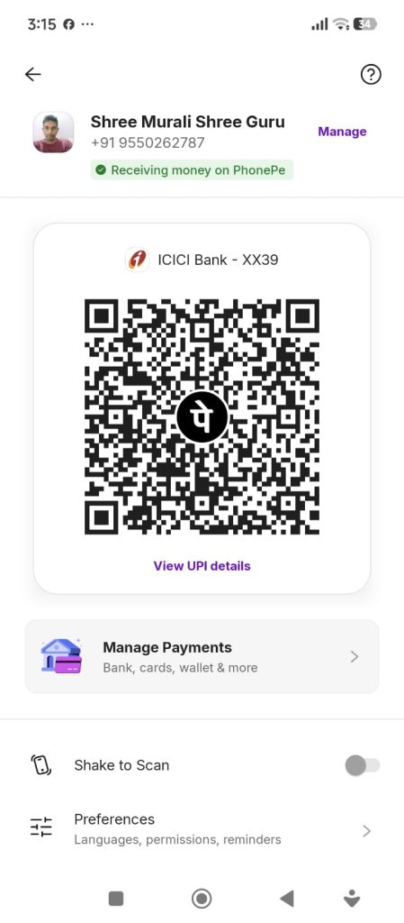 • Offering Guru Dakshina of INR 1800, if you are currently living in India  – you can send via Phonepe App (Number is 9550262787). You can also scan the following QR and send.  Those from India can also pay through Bank. Banking information will be provided, if you can email to dharmayanammm@gmail.com. You will be provided the required information in the email