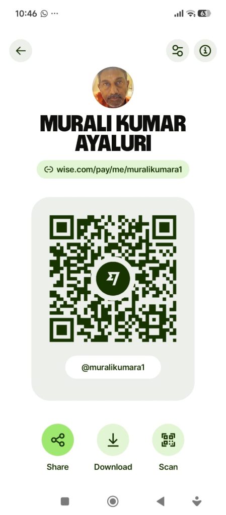 • You can also click on this link https://wise.com/pay/me/muralikumara1 to send guru dakshina on wise